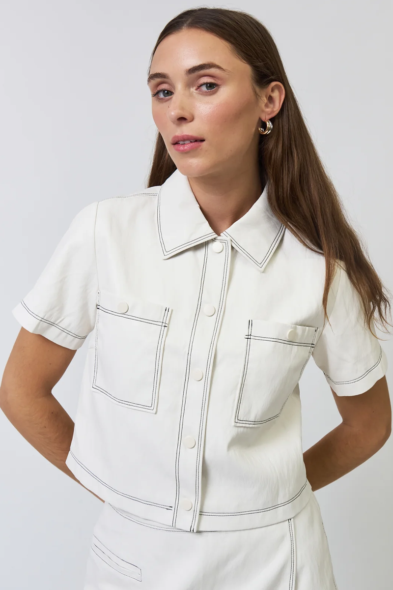 A refined short-sleeve top with a cropped, tailored cut and sleek faux leather exterior. The classic collar and functional front pockets deliver polished versatility, while an interior soft lining ensures all-day comfort. Perfect for contemporary styling that balances structure with ease.